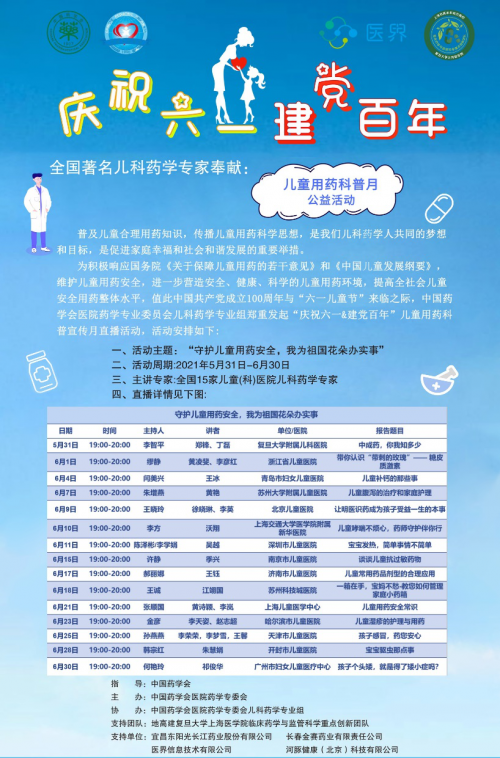 为了贯彻落实国家《关于保障儿童用药的若干意见》、《中国儿童发展纲要》等相关文件精神,普及儿童合理用药知识,降低儿童用药风险,在“6.1国际儿童节”和“中国共产党成立100周年”即将来临之际,中国药学会医院药学专业委员会儿科药学专业组组织全国各家儿童(科)医院的儿科药学专家开展“庆祝六一 & 建党百年”儿童合理用药科普宣传月活动。时间为2021年5月31日至 6月30日,活动期间来自全国15家儿童(科)医院的知名儿科药学专家将在直播间为老百姓奉献精彩纷呈的儿童合理用药科普系列讲座,同时来自全国儿童(科)医院的药师将积极配合本次科普宣传月活动,深入当地社区、学校开展形式多样的儿童用药相关系列科普活动,进行多角度、多层次的宣传报道,提高全社会儿童合理用药、安全用药意识,最大限度保障儿童用药安全。