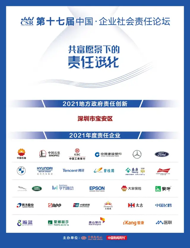 深圳市宝安区荣获“2021地方政府责任创新”。荣获“2021年度责任企业”的有中国石油天然气集团有限公司、中国石油化工集团有限公司、中国工商银行股份有限公司、中国建设银行股份有限公司、北京梅赛德斯-奔驰销售服务有限公司、福特汽车(中国)有限公司、宝马中国与华晨宝马、现代汽车集团(中国)、腾讯、碧桂园集团、泰康保险集团股份有限公司、百威投资(中国)有限公司、捷豹路虎(中国)、北京字节跳动科技有限公司、爱普生(中国)有限公司、大家保险集团有限责任公司、内蒙古蒙牛乳业(集团)股份有限公司、同方股份有限公司、金光集团APP(中国)、中国银联股份有限公司、无限极(中国)有限公司、太古(中国)有限公司、中国飞鹤有限公司、瀚蓝环境股份有限公司、蒙娜丽莎集团股份有限公司、唐山银行、爱康集团、医联集团等。