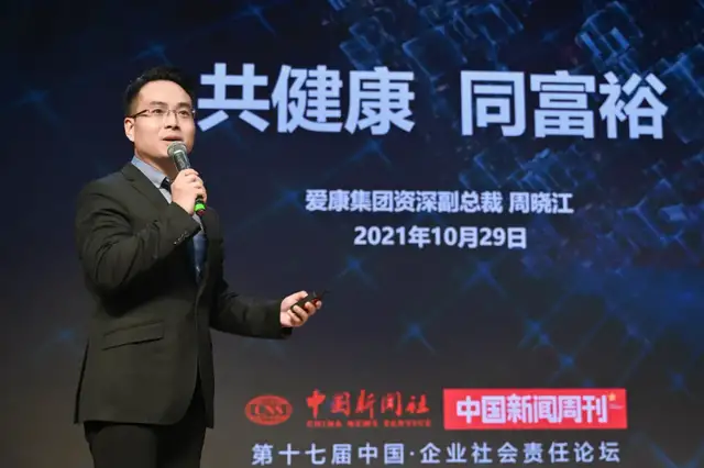 爱康集团资深副总裁周晓江分享了爱康集团在志愿支援国家重大公共卫生事件、长期支持弱势群体、助力医疗健康领域公益事业与推动可持续发展等方面的履责实践。他表示,一家企业发展的终点是回馈社会、不忘初心,从“尽力而为”到“全力以赴”,企业将时刻与国家发展同呼吸、共命运。“所谓医者仁心,我们用医疗从业者的良心,驱使着更大的社会责任担当,致力于提升全民的生命质量。”
