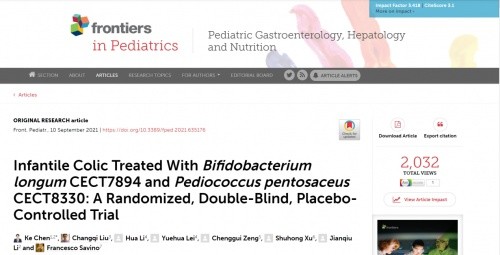 图为陈科博士团队发表于《Frontiers in Pediatrics》上的论文,题为《长双歧杆菌CECT7894和戊糖片球菌CECT8330治疗婴儿肠绞痛:一项随机、双盲、安慰剂对照试验》