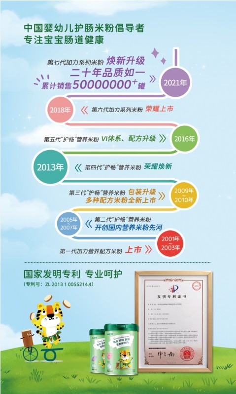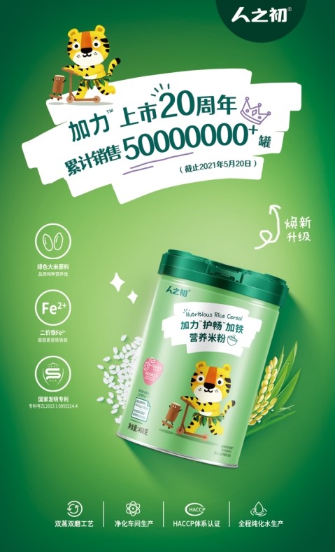 作为有着20年历史的婴幼儿营养食品品牌,人之初秉承着为消费者提供优质的产品和完善的服务,二十年来忠于初心,定位于”专注宝宝肠道健康“的加力系列婴幼儿营养米粉,自2001年第一代营养配方米粉上市便引爆市场,凭借匠心护畅的品质和出众的颜值在线下线上掀起了购买狂潮,迅速成为全行业亮眼的爆款!