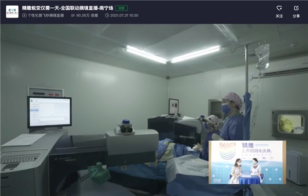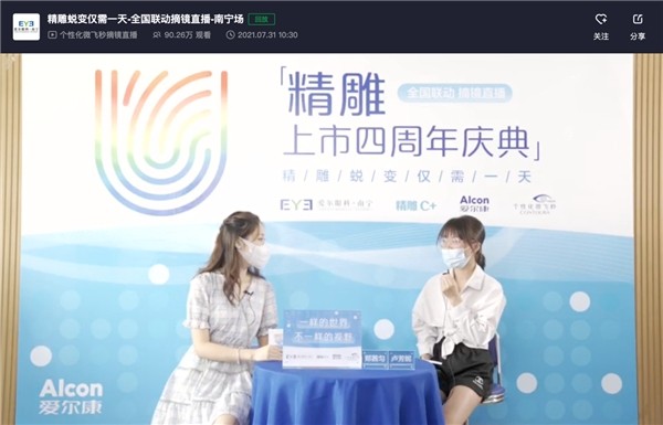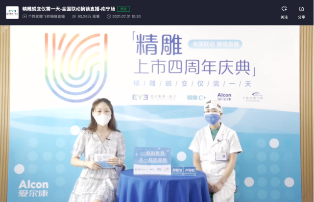 直播邀请到了南宁爱尔眼科医院屈光专科郑茜匀主任为网友们做线上科普分享。除了满满满的干货知识以外,郑主任也现场为大家带来了精雕C+摘镜的全程直播,通过全方位揭秘摘镜手术的全过程,展现了南宁爱尔眼科医院先进的现代化设备、医生精湛的医疗技术水平。整场直播持续约1小时,共计收获90.26万播放量。