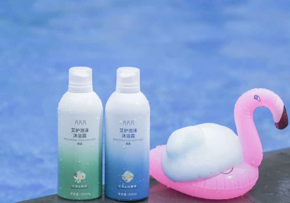 益百分艾护泡沫沐浴露,一摇一按释放艾草精华