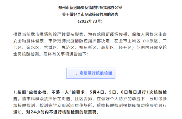 五一假期期间,郑州的疫情突然变得严峻,多地因疫情封控,全市主城区(中原区、二七区、金水区、管城区、惠济区、郑东新区、高新区、经开区)除封控区外,其他区域参照管控区标准管理,实行“足不出区、严禁聚集”管理措施,一切来得猝不及防。为彻底排查潜在人群感染者,坚决有效阻断疫情传播,切实做好全市疫情防控工作,保障人民群众身体健康和生命安全,郑州继续开展全市范围内核酸检测。