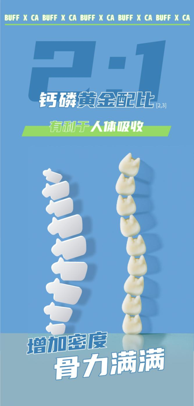 我们都知道母乳中的许多营养成分和配比一直是许多品牌试图研究和模仿的。在母乳中,钙磷比保持在2:1左右。BUFF X Ca钙维生素D3软糖在配方上选择与母乳相同的黄金钙磷比,并且从美国进口更为温和的磷酸盐,保证大部分人群均可食用,减少肠胃刺激易吸收。