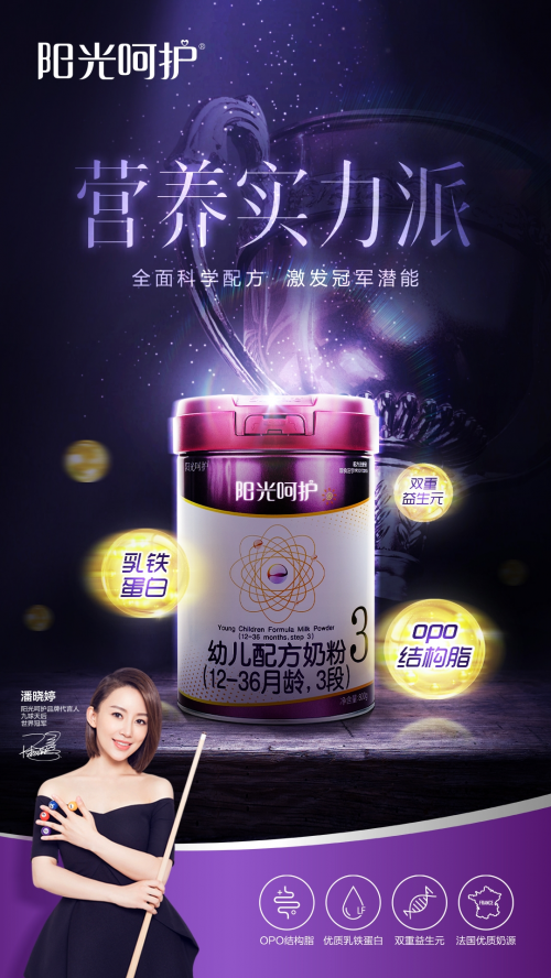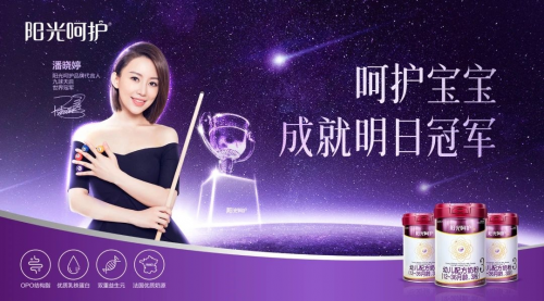 九球天后—潘晓婷代言阳光呵护配方奶粉,为阳光呵护品质认证。