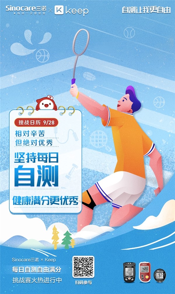 对此,三诺生物对“症”出击,聚焦3亿运动人群聚集的Keep App,邀请Keep达人、Nike签约教练、美国必确签约培训师王鹏担任三诺自测满分青年大使,并携手Keep全面开展四大健康打卡活动,以期让健身成为一项时尚又容易开展的运动。