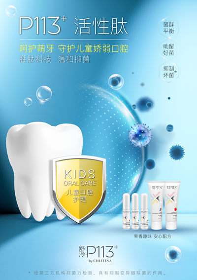 养成良好的口腔护理习惯很重要,在口腔护理产品的选择上也很重要。儿童产品选择首要考虑的因素是安全。克丽缇娜携手中国台湾普生实验室,研发了舒冷P113+儿童口腔护理系列产品,该系列产品中添加了利用胜肽合成技术制成P113+活性肽成分,P113+是抑菌活性肽,其发现于人类口腔分泌的免疫蛋白*Histatin中,抑菌机制温和不刺激,通过抑制坏菌、助留好菌、维持口腔菌群平衡。预防口腔问题就是抑制口腔“坏菌”,舒冷P113+儿童口腔护理系列产品针对“坏菌”,不伤“好菌”,帮助口腔夯实微生态健康平衡,从根源上呵护口腔健康。