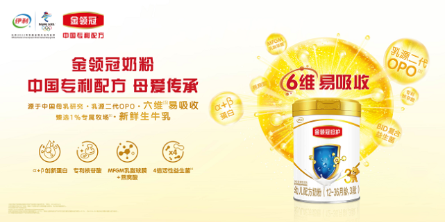 在中国专利配方的加持下,2020年下半年,伊利金领冠全新产品已经完成了焕新升级,其中金领冠“当家王牌”珍护系列,还通过对母乳中六大核心营养素结构的系统模拟和科学配比,创新打造了“六维易吸收体系”,以更贴合乳源的配方,在营养好吸收之上,显著提升宝宝的认知力、自护力,给婴幼儿更专业的营养支持和成长助力。同时,为了保证奶粉营养的珍稀性和高活性,伊利金领冠珍护还臻选北纬45°全球公认黄金奶源带上伊利自有的1%珍稀牧场,从源头锁定了“金牌品质”。