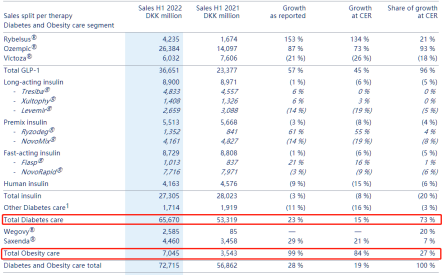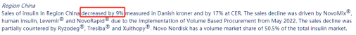 值得关注的是,胰岛素业务作为诺和诺德往日的优势领域,如今已风光不再。诺和诺德胰岛素业务2022年上半年同比下降3%,跌至273亿丹麦克朗,中国区胰岛素业务下跌尤为明显,达到9%,按固定汇率计算下跌17%,公司认为下跌原因主要为中国集采政策导致。