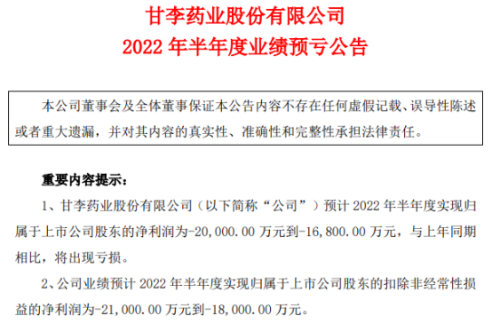 而同为行业龙头的甘李药业则直接陷入亏损。甘李药业预计,今年上半年将亏损1.68亿元-2亿元,同比由盈转亏,这也是甘李药业上市以来的首次亏损。
