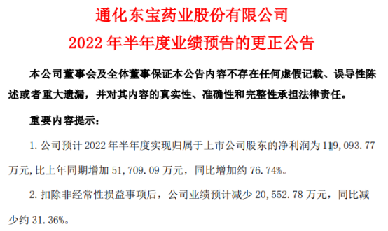 通化东宝预计,今年上半年净利润为11.91亿元,同比增加76.74%。但扣非净利润预计将同比下滑31.36%。之所以净利润能大幅增长,主要是因为通化东宝出售了厦门特宝生物工程股份有限公司部分股份,扣非净利润反映了其主营业务的真实情况。