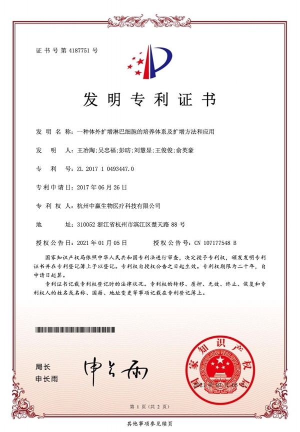 中赢生物在众多研究项目中收获了喜人成果。迄今为止,除了第四代IL21扩增NK细胞技术外,中赢生物还有多项核心技术取得了国家发明专利,并拥有许多技术储备:如NK细胞扩增试剂盒的开发与改进、细胞因子NK细胞扩增技术等。