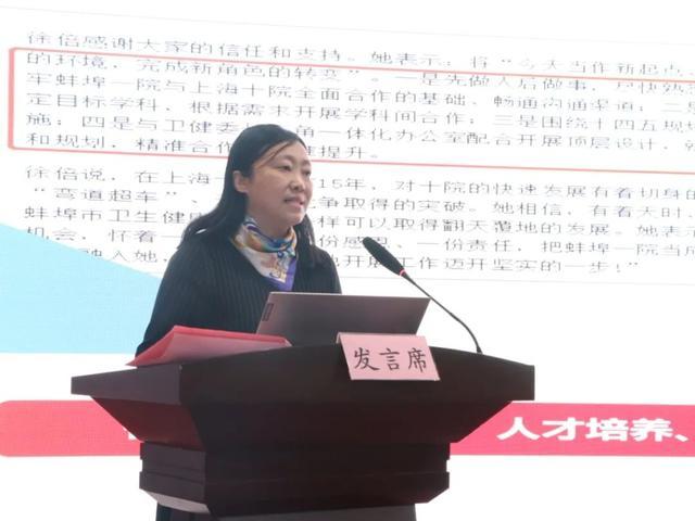 她强调,我们要以此次会议为新的起点,在市委、市政府的坚强领导下,乘着长三角一体化发展的东风,持续加强双方深度合作,聚焦医院重点学科建设、运行机制改革、人才队伍建设、环境布局优化等重点领域和关键环节,科学合理规划,细化完善措施,持续推进机制体制改革创新,把长三角一体化合作医疗融入蚌埠建设“三地一区”两中心进程,努力开创蚌埠卫生健康事业发展的新局面。