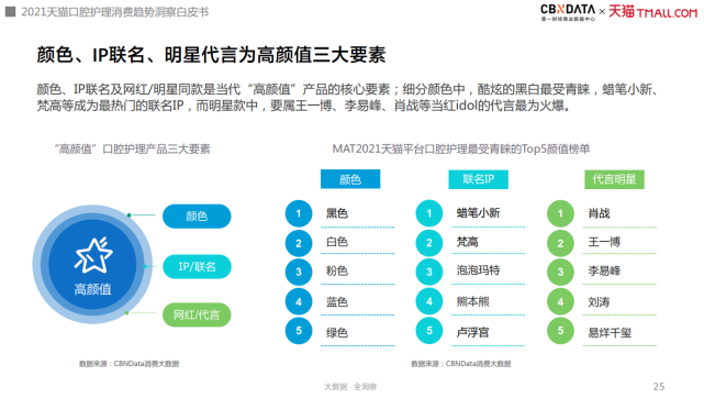 颜值经济下,口腔护理行业“高颜值”相关的搜索热度也明显提升,Z世代较整体而言更关注产品的颜值。而颜色、IP联名与网红同款/明星代言是凸显口腔护理产品颜值的三大要素:颜色上,黑、白、粉最受青睐;联名IP当中,蜡笔小新备受喜爱;同时,肖战、王一博等明星的代言也最受消费者欢迎。