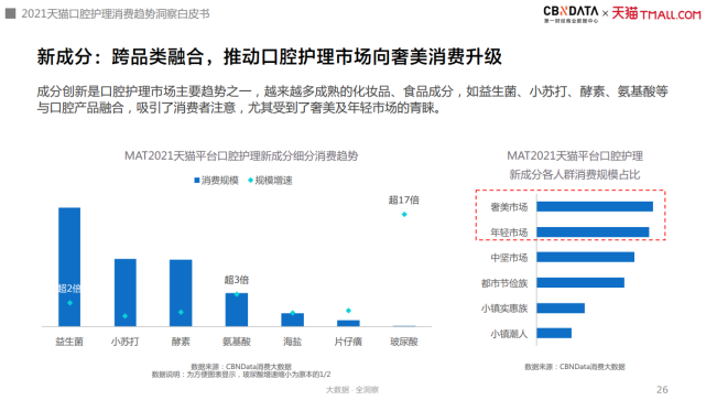 在品类上,成分、形态、口味的创新为口腔护理市场注入新的活力。根据CBNData《白皮书》显示,益生菌、小苏打、酵素等成分逐渐融入口腔产品,其中玻尿酸、氨基酸、益生菌等成分均呈现出较高增速,引起市场关注。消费群体当中,奢美市场与年轻市场最为青睐这些新成分。