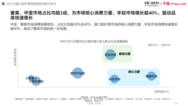 将消费人群根据年龄、城市线级与购买力进行细分,购买力较高的奢美、中坚市场占比分别超过40%和30%,成为口腔护理市场的核心消费力量,而18-25岁的年轻市场以超过40%的增速成为行业的驱动力量。