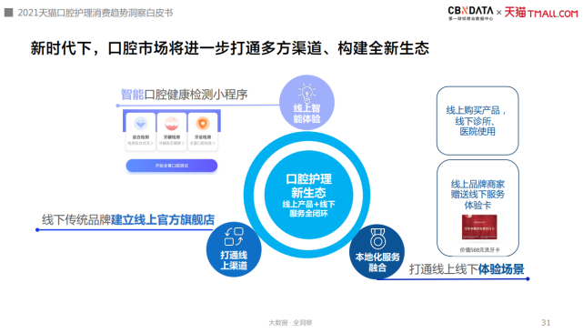 最后,口腔市场在数字经济、新零售的带动下,也在逐渐构建起一个环环相扣的口腔护理新生态。从线上的口腔健康监测等智能体验,到线上购买渠道,以及线上线下融合的本地化服务,口腔护理行业围绕“产品+服务”正在迈入新的发展阶段。