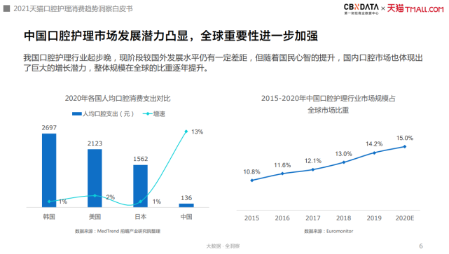相较韩国、美国、日本等国家,我国的人均口腔消费支出较低,但增速尤其突出,呈现出巨大的消费增长潜力。