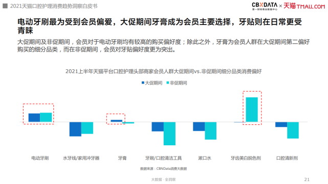 其中,女性、85-95后的轻熟一代与一二线城市的消费者更具有会员意识。相比非促时期,会员人群在年货节、三八节、618等大促节日的下单意愿更强,消费规模占比高于非会员。不管是否在大促期间,会员对电动牙刷的购买偏好度都较为显著,而大促期间会员更偏好购买牙膏,非促期间则更偏好牙贴。