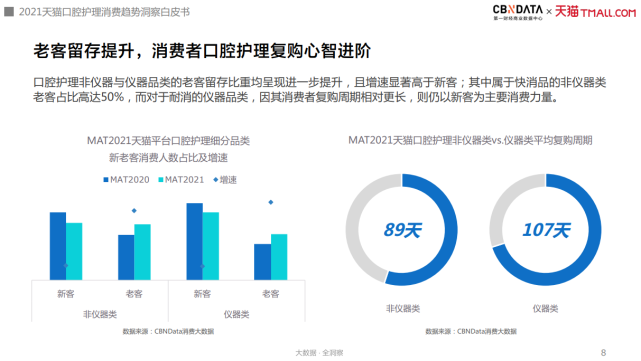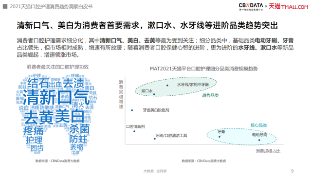 9月19日,第一财经商业数据中心(CBNData)联合天猫发布《2021天猫口腔护理消费趋势洞察白皮书》(以下简称CBNData《白皮书》,点击阅读原文查看完整内容),依托CBNData 消费大数据,概览口腔护理行业发展现状,洞察分析消费人群的画像及特征,并从颜值、品类、场景、生态四大维度总结口腔护理消费新趋势。