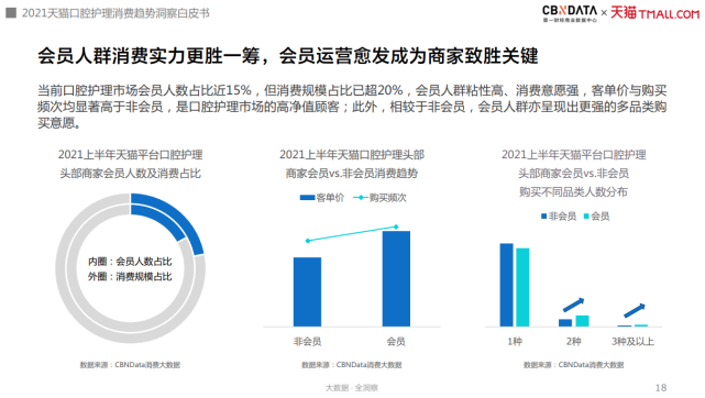 据CBNData《白皮书》,口腔护理市场的会员人数占比近15%,而消费规模占比超20%,其客单价与购买频次也显著高于非会员,且倾向于购买更多不同品类。会员人群凭借着高消费力成为口腔护理品牌商家们关注的重点。