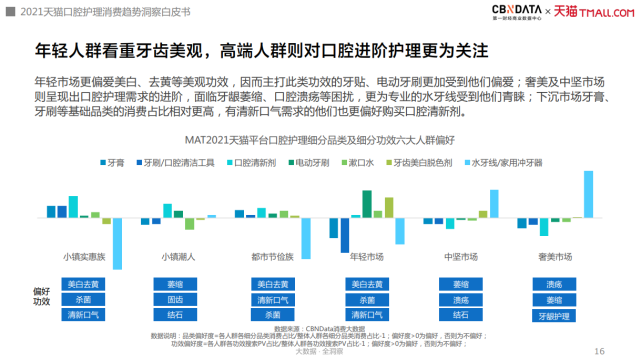 不同人群对于功效的追求也有所差异,奢美市场与中坚市场面临口腔溃疡、牙龈萎缩等问题,更为偏好水牙线等专业进阶的口腔护理产品;年轻市场则更关注美白去黄、杀菌、清新口气等功效,产品上更偏好电动牙刷、牙贴、漱口水等。