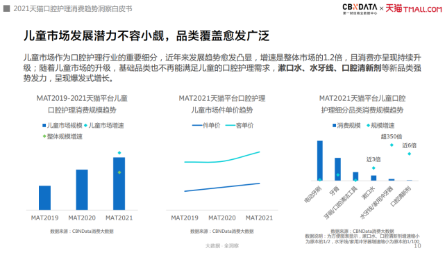 此外,儿童口腔护理以整体市场1.2倍的消费增速而备受关注。根据CBNData《白皮书》显示,天猫平台儿童口腔护理市场规模逐年扩大,且客单价、件单价均呈增长趋势,消费升级趋势显著。而且在电动牙刷与牙膏等基础品类之外,儿童用的漱口水、水牙线、口腔清洗剂等品类也呈现出爆发式增长。