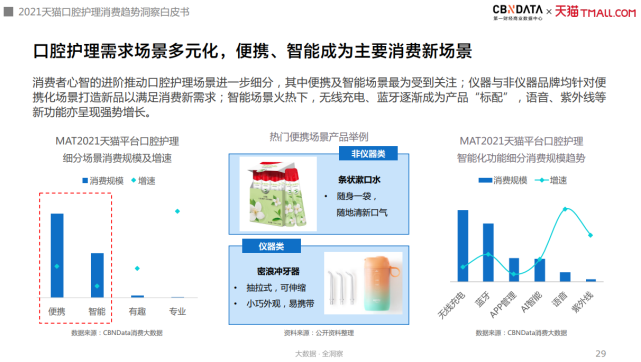 根据CBNData《白皮书》显示,在口腔护理细分场景当中,便携、智能场景的消费规模较高,条状的漱口水、小巧的冲牙器等便携的产品受到许多消费者的欢迎。