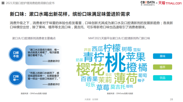 而缤纷的口味出现,也解决了消费者对于漱口水、口腔清新剂口感不佳等痛点,比如桃子、青柠等果味,与樱花、薄荷等植萃口味,另外也有莫吉托、可乐等新奇口味出现。