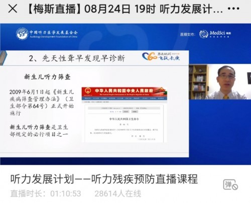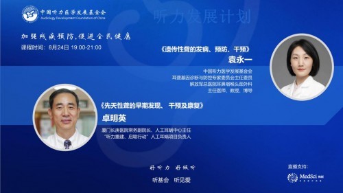 2021年8月25日是我国第五个全国残疾预防日,中国听力医学发展基金会紧密围绕预防日主题“加强残疾预防,促进全民健康”,为让更多的耳鼻喉科医生能对听力残疾预防的概念及内涵有更深入的了解,“听力发展计划”系列云课堂于2021年8月24日晚19:00开启了直播课程。课程邀请到中国听力医学发展基金会耳聋基因诊断与防控专家委员会主任委员、解放军总医院(301医院)耳鼻咽喉头颈外科主任医师、博士生导师袁永一教授和厦门长庚医院常务副院长、人工耳蜗中心主任卓明英教授直播授课。两位专家分别从《遗传性聋的发病、预防、干预》和《先天性聋的早期发现、干预及康复》两个议题切入,帮助从事听力医学的医护人员、关注听力残疾的社会公众、以及新婚夫妇、孕产妇、婴幼儿家长、听障群体等重点人群认识、了解相关的听力残疾预防知识,学习尽早发现、尽早干预的方法。直播课程由中国听力医学发展基金会执行副秘书长甄丽霞主持,2万8千多听力医护人员、康复人员及网友参与直播课程。