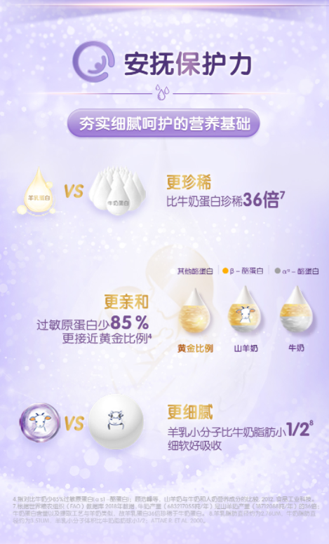 “羊奶粉”、“纯羊”、“半羊”到底是什么?还有一些宝妈不知道它们的区别是啥,哪个更好。其实,“纯羊”、“半羊”都不是标准的正式叫法,只是业内人士的通俗叫法,其中“纯羊”往往指含纯羊乳蛋白配方而不含牛乳清蛋白的羊奶粉,而“半羊”指的是含有牛乳清蛋白和羊乳清蛋白的羊奶粉。 如今奶粉新政相关文件明确规定:同一乳制品原料有两种以上动物性来源的,应当标明各种动物性来源原料所占比例,这再次提高了羊奶粉行业的准入门槛。对比牛奶来说,羊奶蛋白对比牛奶蛋白来说更温和,羊奶中过敏原蛋白αS1-酪蛋白的含量要比牛奶更少,合生元可贝思羊奶粉是高端婴幼儿营养与健康品牌合生元旗下的高端羊奶粉品牌,与传统配方羊奶粉品牌不同,特别添加36倍珍稀的纯羊乳蛋白,给宝宝带来更纯净的呵护。