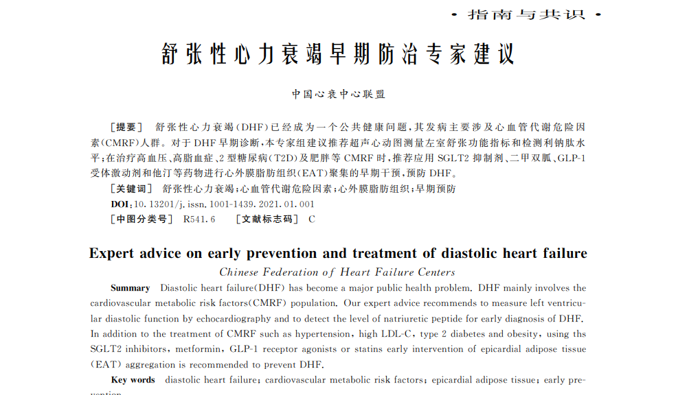 2020年12月25日,由中国心衰中心联盟制定的《舒张性心力衰竭早期防治专家建议(2021)》(以下简称《专家建议》)在《临床心血管病杂志》上正式在线发布。《专家建议》指出,舒张性心力衰竭(DHF)目前已经成为全社会的一个公共健康问题,其发病主要涉及心血管代谢危险因素(CMRF)人群;强调加强对舒张性心力衰竭患者的早期诊断,早期干预;并推荐具有改善心室舒张功能的芪苈强心胶囊用于舒张性心力衰竭的早期防治。芪苈强心胶囊成为此次《专家建议》唯一推荐中成药。
