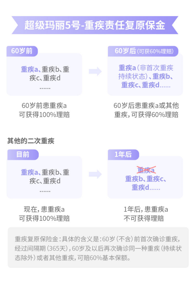 重疾复原保险金针对的是60岁(不含)前患重疾,60岁后二次重疾保障需求。
