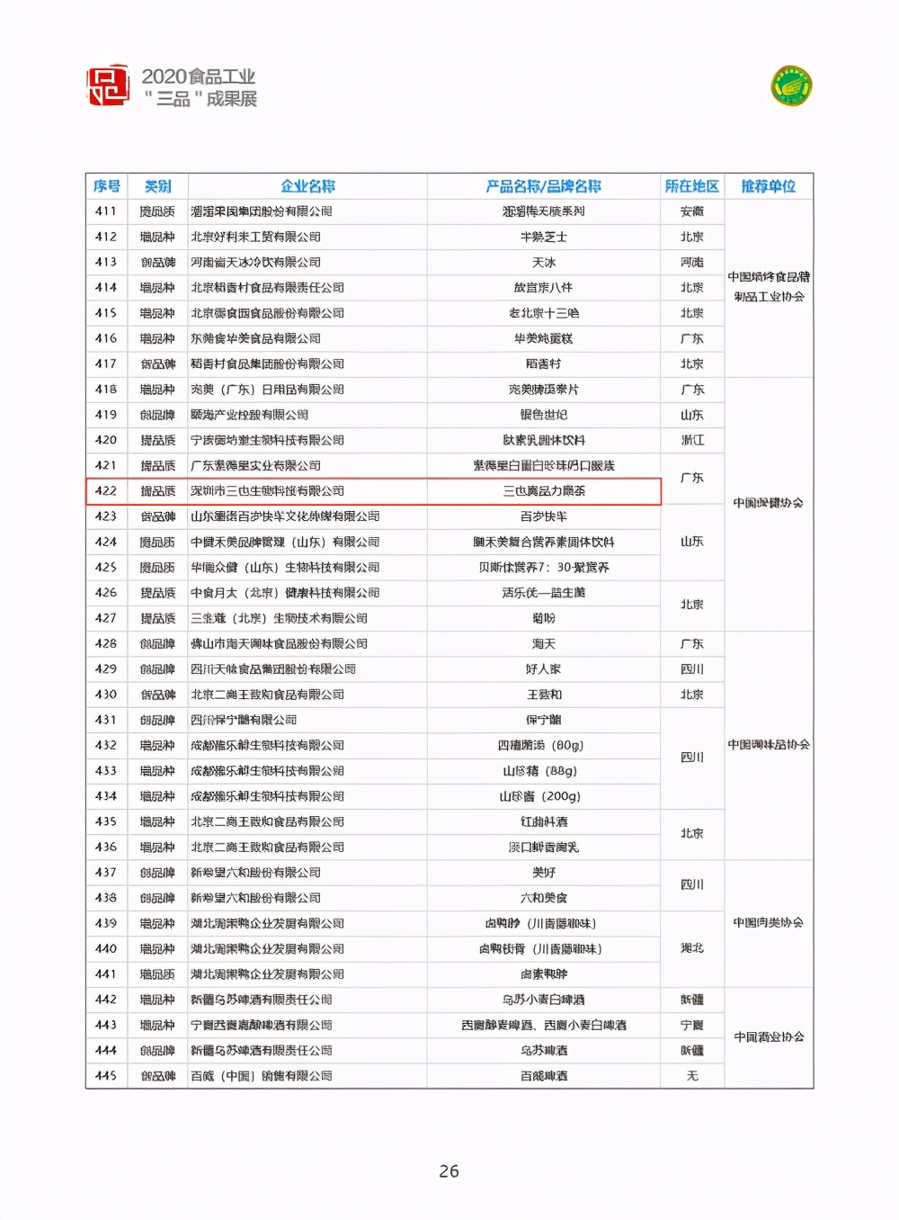 据悉,工业和信息化部在“三品”专项行动中取得明显成效。全国食品抽检总体合格率稳步提高,骨干企业品牌建设效果突出,品牌国际化步伐加快。工业和信息化部组织地方工业主管部门、全国性食品行业协会(学会)推荐了双汇、茅台、伊利等458项食品领域增品种、提品质、创品牌的典型成果进行线上展示。三也大健康集团旗下三也真品力鼎茶荣获2020食品工业“三品”成果展品质荣誉。