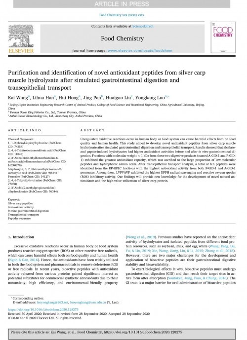 近期,人民国肽教授工作站、中国农业大学罗永康教授团队联合人民国肽科研团队在国际食品顶尖期刊《Food Chemistry》(食品化学)发表文章《Purification and identification of novel antioxidant peptides from silver carp muscle hydrolysate after simulated gastrointestinal digestion and transepithelial transport》(具有抗氧化功能的鱼肉蛋白肽的制备、鉴定与模拟肠胃消化研究)。该研究旨在从鲢鱼肌肉中开发新型抗氧化肽,并模拟胃肠道消化和跨上皮转运。结果表明,碱性蛋白酶和木瓜蛋白酶诱导的鲢鱼蛋白水解产物在体外胃肠道消化前后均具有较高的抗氧化活性。