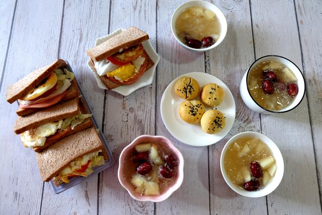 早餐一:黑全麦三明治、苹果银耳汤、蛋黄酥。