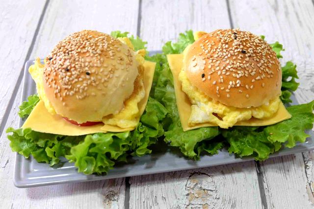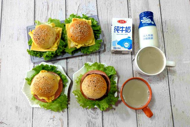 今天的汉堡有3种,有火腿炒蛋汉堡、炒蛋芝士汉堡、牛肉火腿汉堡。每一种都搭配了生菜叶、番茄片、番茄酱,有荤有素,营养美味,也是孩子们特别喜欢的早餐主食之一。