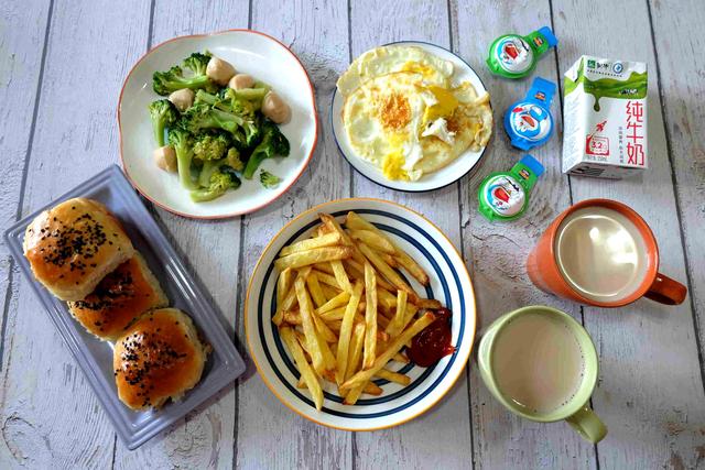 早餐五:咸奶茶、清炒西兰花配鳕鱼丸、煎鸡蛋、空炸薯条、豆沙面包。