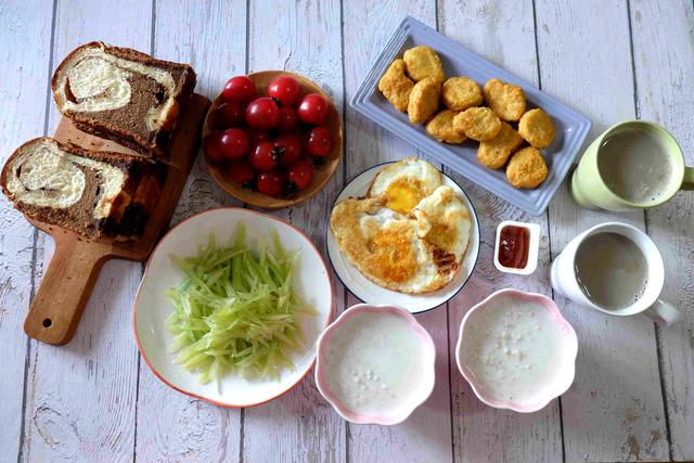早餐七:黑钻吐司、凉拌莴笋丝、煎蛋、炸鸡块、牛奶燕麦粥、红枣豆浆。