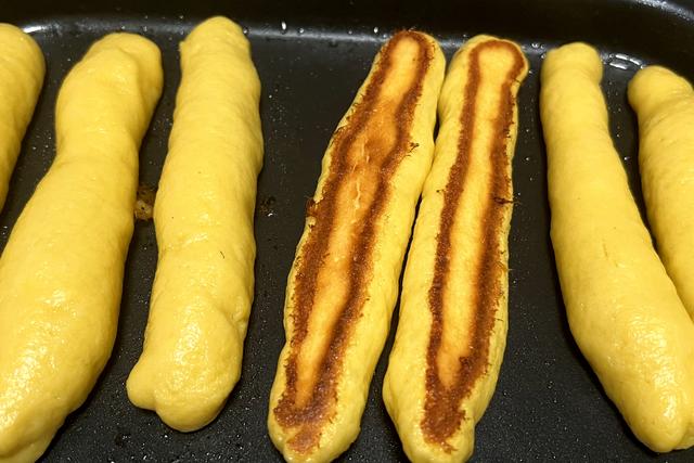 想吃玉米棒馍了,用多功能锅的平底盘做棒馍特别方便。提前一晚用牛奶130g、玉米面150g、普通面粉110g、白糖10g、耐高糖酵母粉2g混合揉成一个面团,发酵至两倍大,取出后简单揉均匀,分成小段,搓长,平底锅加热刷油,放上玉米面段, 200度,先煎2分钟左右,再加一碗清水,盖上锅盖,继续煎10分钟,再打开,如果底部上色不够,可以继续煎1-2分钟即可。