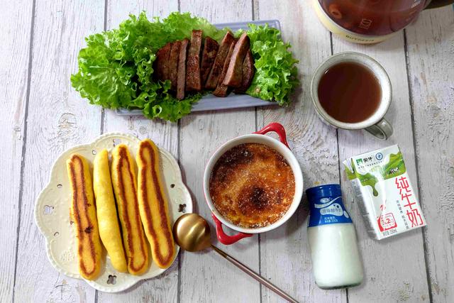早餐四:煎牛排、玉米棒馍、焦糖烤蛋、红枣山楂红豆水。