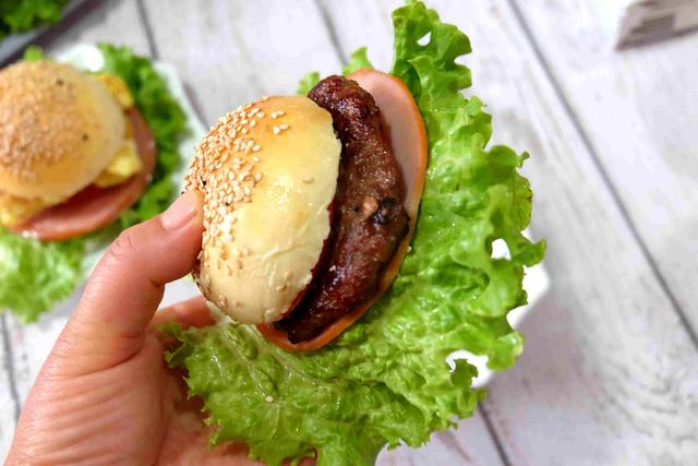 这个是牛肉火腿汉堡,适合喜欢吃肉的小伙伴,牛肉饼可以买现成的,也可以自己绞出牛肉馅,调好味道,做成饼状,煎熟即可,肉香软嫩,非常好吃。