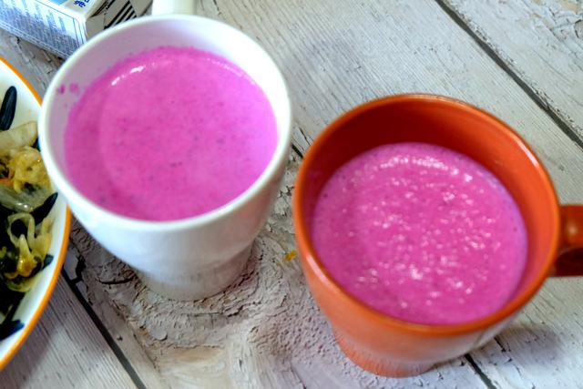 早餐饮品准备了火龙果牛奶,天气渐渐热了,常温的饮品也可以安排上。将火龙果去皮切块,和牛奶一起放到果汁机里,启动机器打成火龙果奶昔,颜色好看,口感香甜,营养也足够丰富,我家经常这么喝。