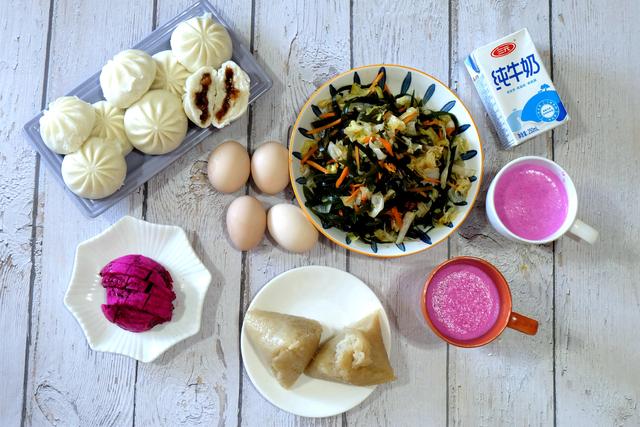 早餐二:叉烧包、凉拌海带、火龙果牛奶、粽子、鸡蛋。