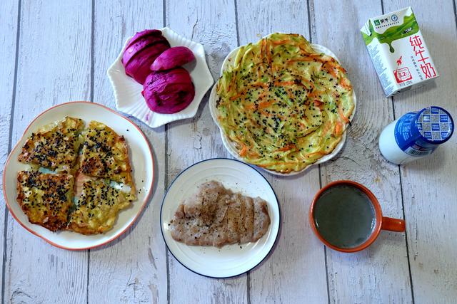 另外还准备了一种咸香口味的早餐饼,将西葫芦和胡萝卜切细丝,加鸡蛋、面粉、清水、盐混合成稀一点的面糊,平底锅烧热放食用油,倒一勺面糊摊平,煎熟一面后翻面,香软营养好吃,简单快手,值得尝试。