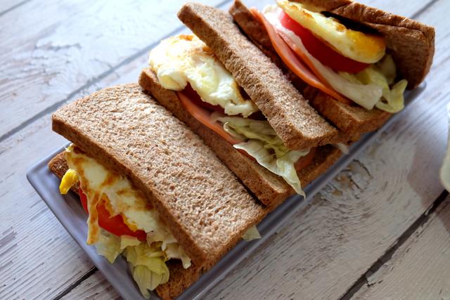 主食是黑全麦吐司,这种吐司片是半切的,特别方便,可以加热,也可以不加热,中间夹上火腿片、番茄片、煎蛋、生菜叶等,再挤上一些沙拉酱或番茄酱,一份健康又好吃的三明治就做好了。简单快手,营养健康,孩子们还挺喜欢。如果是家里的大孩子,可以试着让孩子自己动手做,更有乐趣。