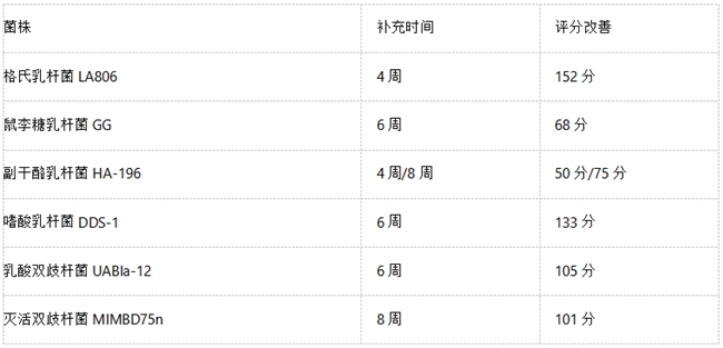 这一数据显著优于其他常见益生菌菌株在类似研究中的表现。例如,鼠李糖乳杆菌GG在补充6周后评分改善68分;副干酪乳杆菌HA-196在4周和8周后分别改善50分和75分;嗜酸乳杆菌DDS-1在6周后改善133分;乳酸双歧杆菌UABla-12在6周后改善105分;灭活双歧杆菌MIMBD75n在8周后改善101分。