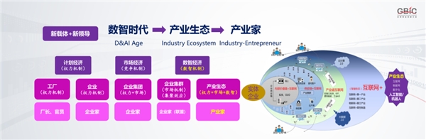 在新背景下一定会出现新载体,换句话说,在数智时代会涌现出一批产业生态,而这些产业生态又不断孕育出各类企业家。简单梳理下从计划经济到市场经济再到数智经济的变化过程,计划经济时代,工厂是主要载体,不管是厂长还是其他管理层,都是以权利来划分;市场经济时代,我们有了企业和企业家,后市场经济时代,出现了很多产业集群,它们以聚集效应形成产业的优势,但也仅仅停留在了多个企业采用集聚效应的层面;而进入数智时代之后,随着产业集群效应的增强,产业生态应运而生。