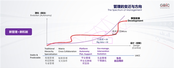 企业的发展其实是一条曲线,会面临各种挑战,透过这些挑战,我们会发现不同时代所依赖的机制大有不同。计划经济时代的特点是控制权力机制,市场经济时代主要特点是交叉矩阵交叉协作。如今,我们进入到一个平台经济或者生态经济的环境中,它最大特点是一种自制博弈,从过去横向的控制、设计、权力的机制,让位一种演化的机制,新机制模式下,个人权力被弱化,更加强调合作关系。所以,未来的管理需要两种机制,一种是控制机制,另一种是演化的机制,没有任何一个人可以决定未来的走向,因为这个世界是互动的过程。